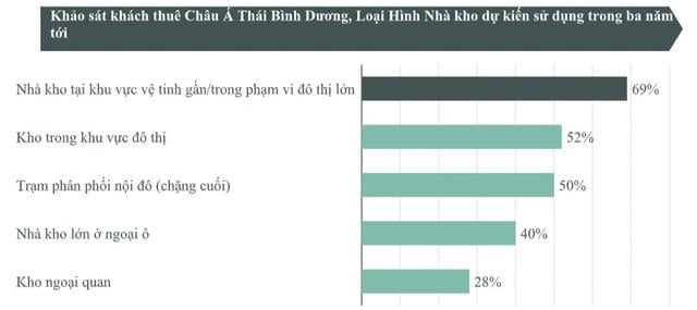 Khảo sát khách thuê Châu Á – Thái Bình Dương của CBRE cho thấy, các nhà kho tại khu vực vệ tinh gần các đô thị lớn dự kiến sẽ được sử dụng nhiều nhất trong 3 năm tới, do các chi phí vận tải và nhân công tăng cao đi kèm với tác động của Covid-19.