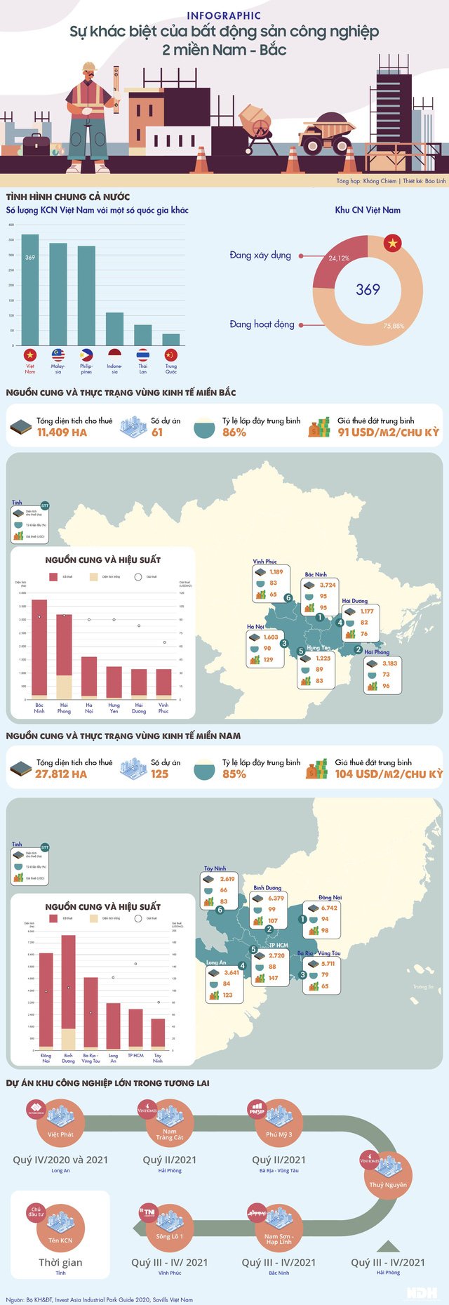 Cả nước có 369 khu công nghiệp, trong đó đang hoạt động chiếm 76%, còn lại đang xây dựng. Tổng diện tích các khu công nghiệp phía Bắc bằng một nửa phía Nam, giá thuê trung bình thấp hơn 13%, đạt 91 USD/m2. Các dự án khu công nghiệp lớn trong tương lai được kỳ vọng ở Hải Phòng, Vĩnh Phúc, Bà Rịa – Vũng Tàu, Long An.